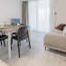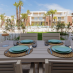 Due camere: matrimoniale principale, seconda per 3 persone con letti singoli. Bagno moderno con asciugacapelli e prodotti cortesia. Cucina attrezzata: macchina caffè, microonde, piano induzione, frigorifero, freezer, utensili completi. Soggiorno con smart TV ultima generazione, Wi-Fi super rapida. Giardino privato con tavolo, sedie, sdraio per pranzi all'aperto. Parcheggio privato garantito. Resort con piscina 2.000mq sabbia bianca, ombrelloni, sdraio. Ideale famiglie o gruppi per vacanze sceicche.