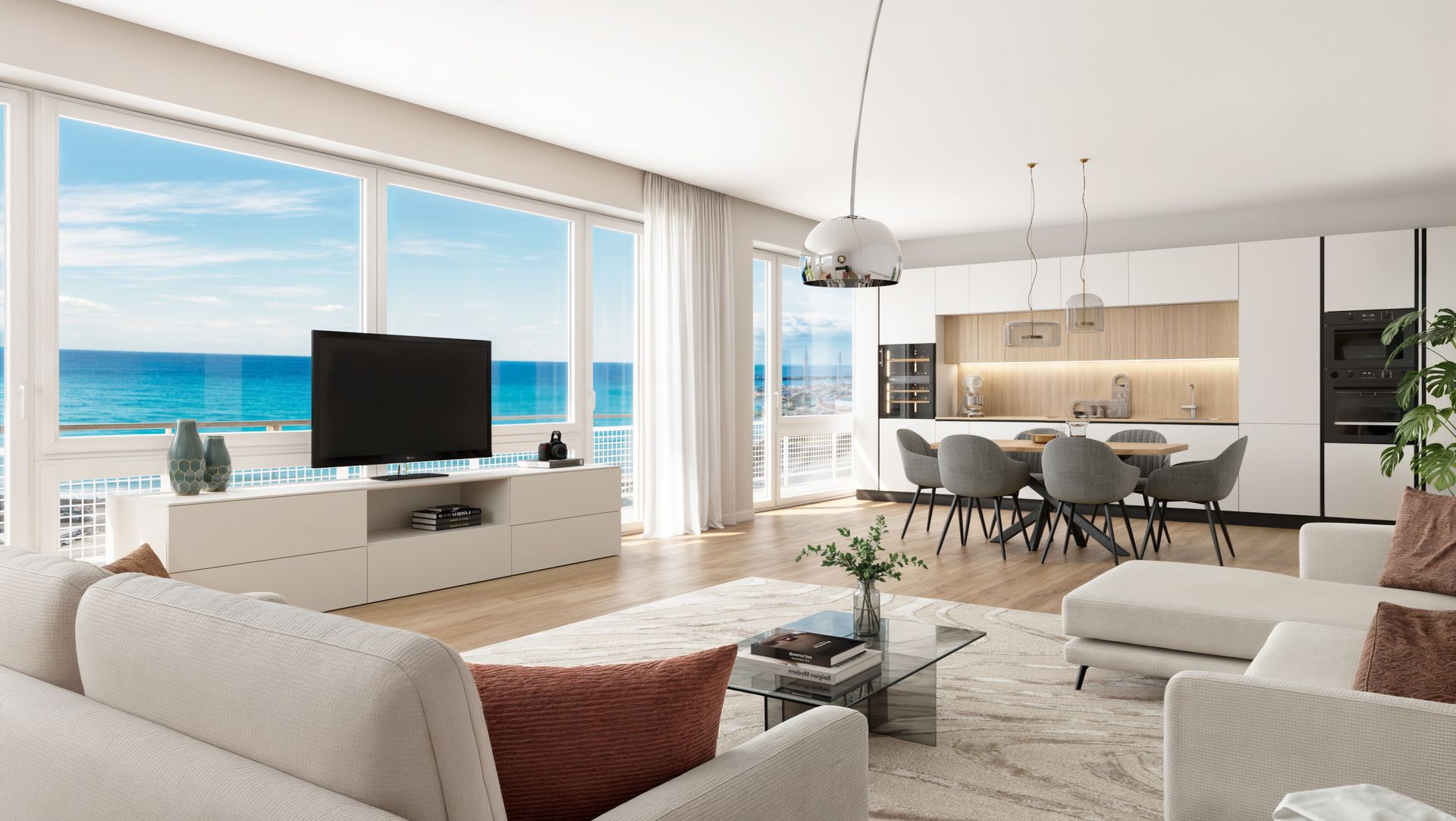 Il progetto prevede un ampio salone doppio con angolo cottura, affacciato sulla balconata panoramica, con esposizione a Sud, che garantisce eccezionale luminosità e una vista aperta sul mare e sul nuovo Waterfront, con accesso esterno da tutti i locali principali.