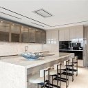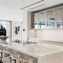 Gli interni esprimono un lusso raffinato e senza tempo: superfici in pietra Cristallo, arredi su misura firmati Italcraft e una cucina professionale dotata di elettrodomestici Wolf e Sub-Zero, pensata per performance d’eccellenza.