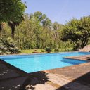I porticati aperti sulla piscina inviatano verso un viale alberato che entra nel parco del Taro.