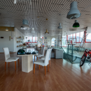 Salendo al primo piano, ci accoglie un open space espositivo luminosissimo, grazie alle ampie vetrate che avvolgono l’intera struttura, creando un ambiente che lascia letteralmente senza fiato. Questo spazio è perfetto per showroom di lusso, eventi aziendali o esposizioni che richiedono una cornice unica e scenografica.
