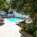 Giardino con piscina privata, vani tecnici, e vista sulla marina e sul borgo medioevale.