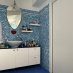 Una scala in legno conduce alla mansarda dove un open-space con camera da letto e studio è adiacente ad un grande terrazzo con vista mare e ad un bagno con mosaico blu e ampia doccia.