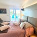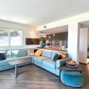 L’ingresso è protetto da porta blindata e si apre su un soggiorno luminosissimo, grazie alle grandi vetrate esposte a sud. La luce naturale accompagna tutta la giornata e da qui, come anche dagli spazi esterni, la vista mare è semplicemente splendida. È uno di quegli ambienti che ti fa sentire subito a casa.