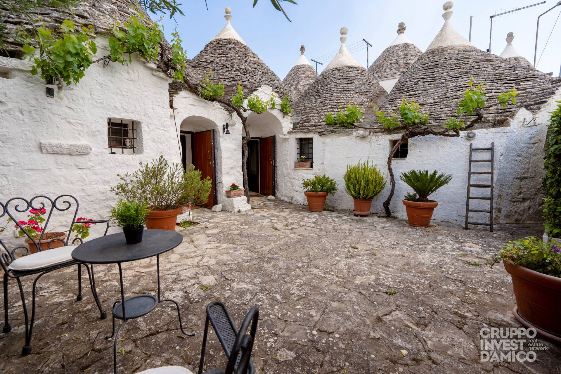 In vendita un affascinante gruppo di trulli composto da 8 coni, nel cuore della Valle d’Itria. La proprietà, oggetto di una ristrutturazione conservativa che ha preservato pavimenti in chianche originali e coni in pietra a vista, offre un’ampia zona living con soggiorno dotato di doppio ingresso, area relax con camino e sala da pranzo dalla quale, tramite una scala in legno, si accede al soppalco che ospita la prima camera da letto. Dalla zona living si raggiungono il cucinino, una seconda camera da letto con alcova al cui interno è stato ricavato un servizio, e una terza camera da letto con bagno privato, oltre a un ripostiglio attualmente utilizzato come ulteriore bagno per la zona giorno. All’esterno sono presenti un accesso pedonale tramite spiazzo comune pavimentato in chianche e un accesso carrabile dal retro, attraverso un giardino con piante ornamentali e camminamenti in pietra che conduce a un cortile privato anch’esso rifinito con chianche originali. Completano la proprietà un locale tecnico, un terreno con alberi da frutto e una superficie complessiva, tra coperto e scoperto, di circa 1.432 mq. L’immobile è dotato di cisterna collegata all’acquedotto rurale e riscaldamento autonomo con bombolone GPL interrato, rappresentando una soluzione ideale per chi desidera un’abitazione autentica immersa nella tradizione pugliese o un investimento in un contesto di grande fascino.