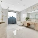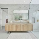 Il bagno padronale, ispirato alle migliori spa di lusso, è rivestito in lastre effetto marmo a venatura continua e offre: