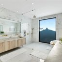 Il bagno padronale, ispirato alle migliori spa di lusso, è rivestito in lastre effetto marmo a venatura continua e offre: