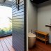 La villa comprende tre camere da letto e due bagni di alto livello, dotati di docce emozionali e finiture di pregio. Al centro della casa, un giardino interno con piante orientali rare e luce zenitale rafforza il legame tra spazi interni ed esterni.