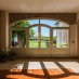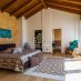 La prima abitazione si apre con un ampio salone, dove il camino e le vetrate creano un’atmosfera avvolgente, piena di luce e calore.